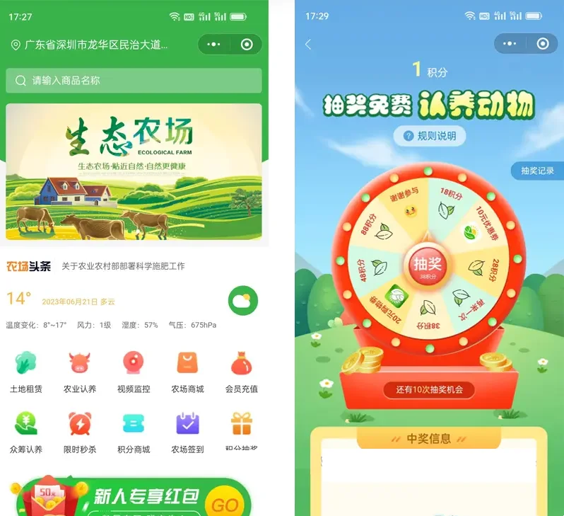 功能简介:土地种植、农业认养、积分商城、农场活动、视频监控、农场商城、实时数据监控、限时秒杀、农业众筹、送货上门、一键分销、农场入驻、全部店铺
