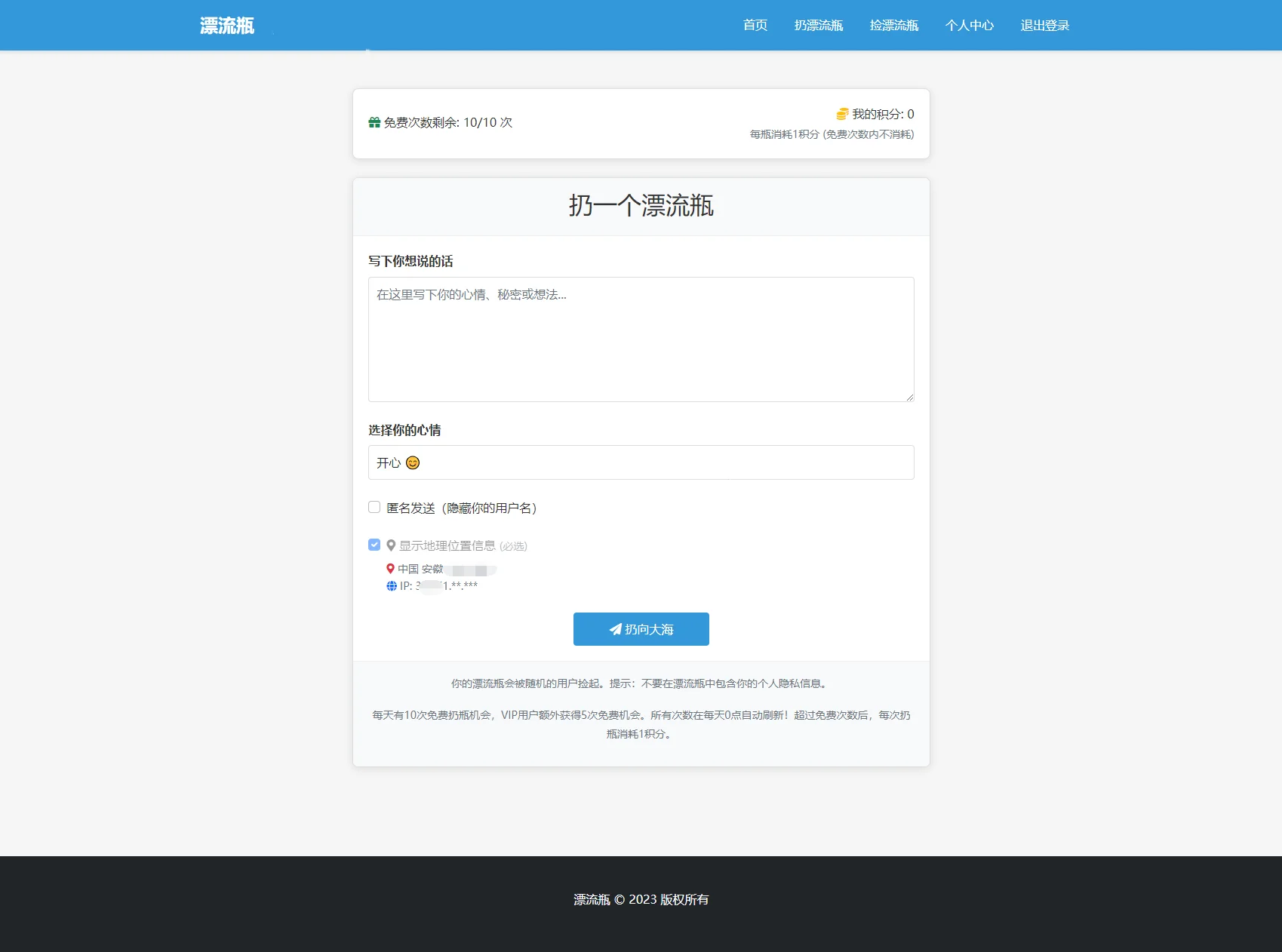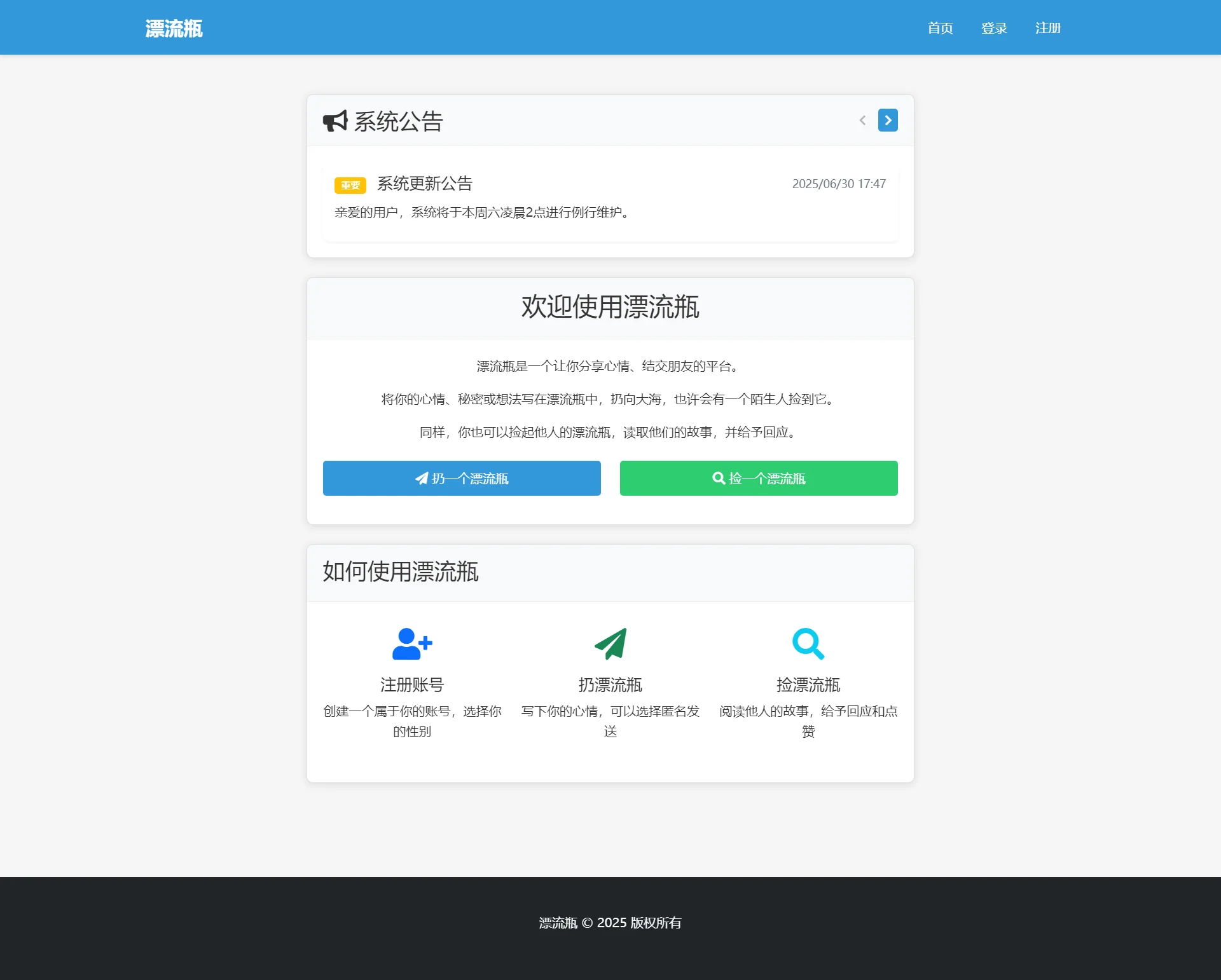 漂流瓶系统是一个轻量级的社交平台,旨在为用户提供一个安全、匿名的空间来分享内心感受、结交新朋友。它借鉴了“漂流瓶”这一经典概念,将用户的想法和情感以数字化的形式投入互联网的海洋,等待有缘人发现。