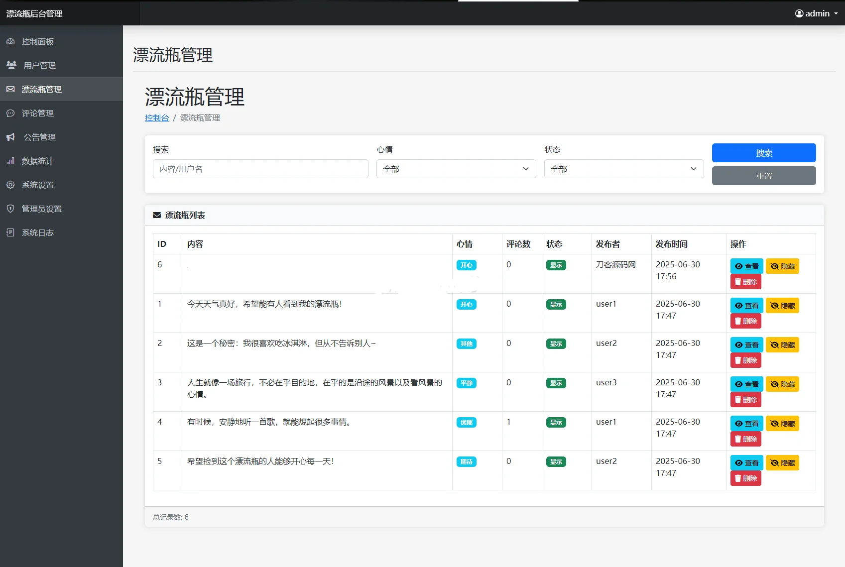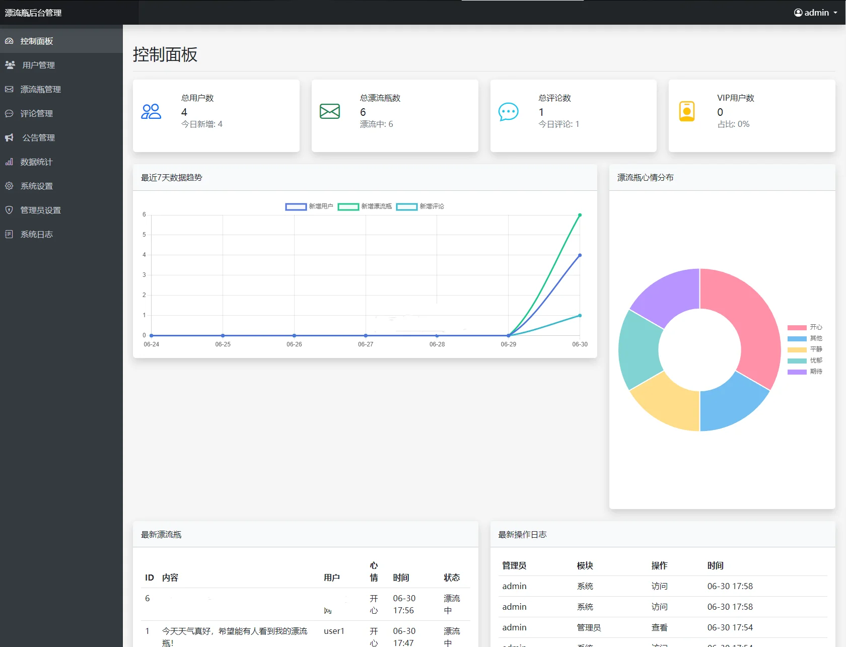 内容管理:管理漂流瓶、评论,发布公告。