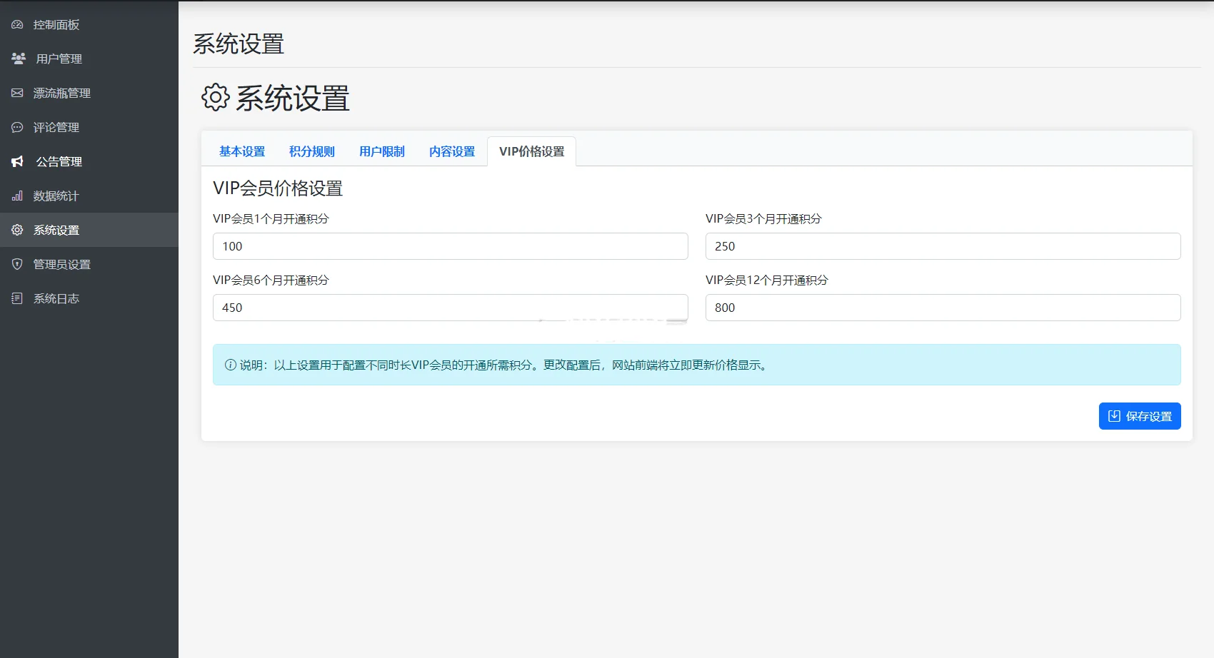 系统设置:配置基础参数、积分规则、VIP 特权、安全策略。