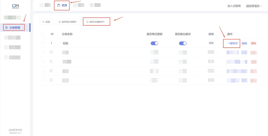 4 后台 – 资源 – 分类管理 – 一键转存 – 设置好每日更新 – 这样就能解放双手了