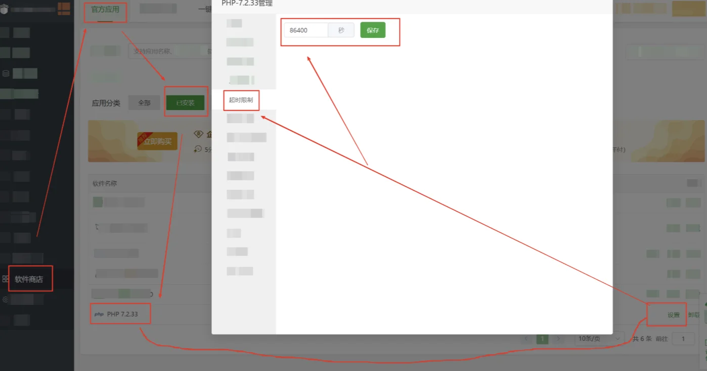 解决办法:修改超时限制至最大值 86400 保存后,PHP 需重启服务(如下图)。