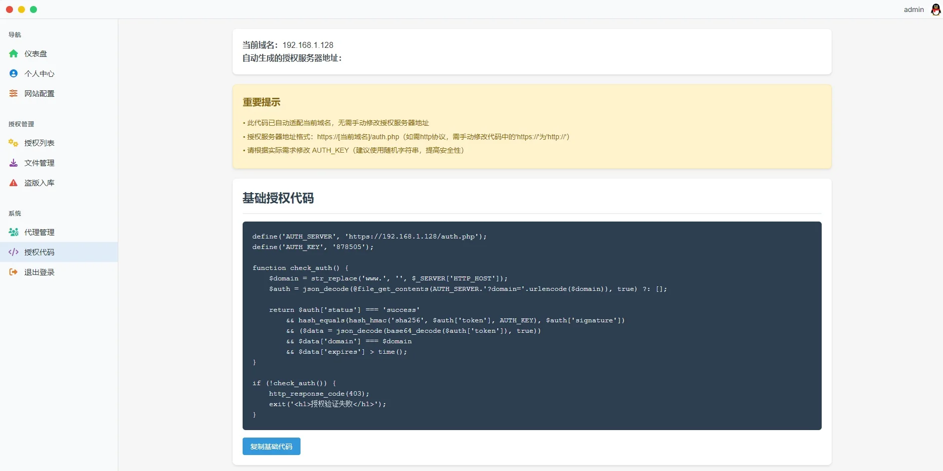 源码说明就是:一个PHP+MYSQL+Element的授权系统,支持后台添加代理,清晰明了的授权列表信息,以及盗版入库,和在线上传文件