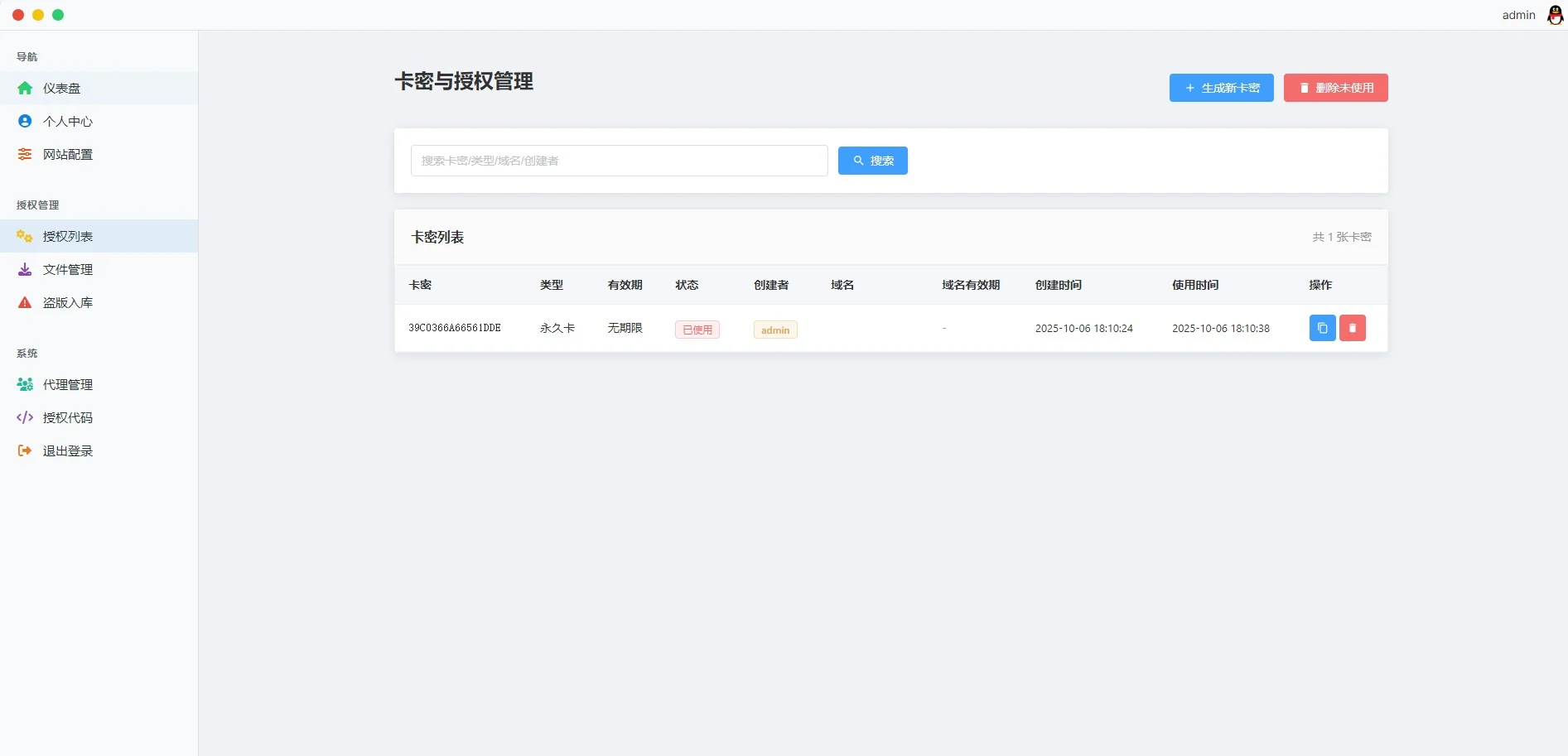 全部开源的,支持代理分销,盗版入库、卡密生成,用户可首页自行输入卡密进行授权