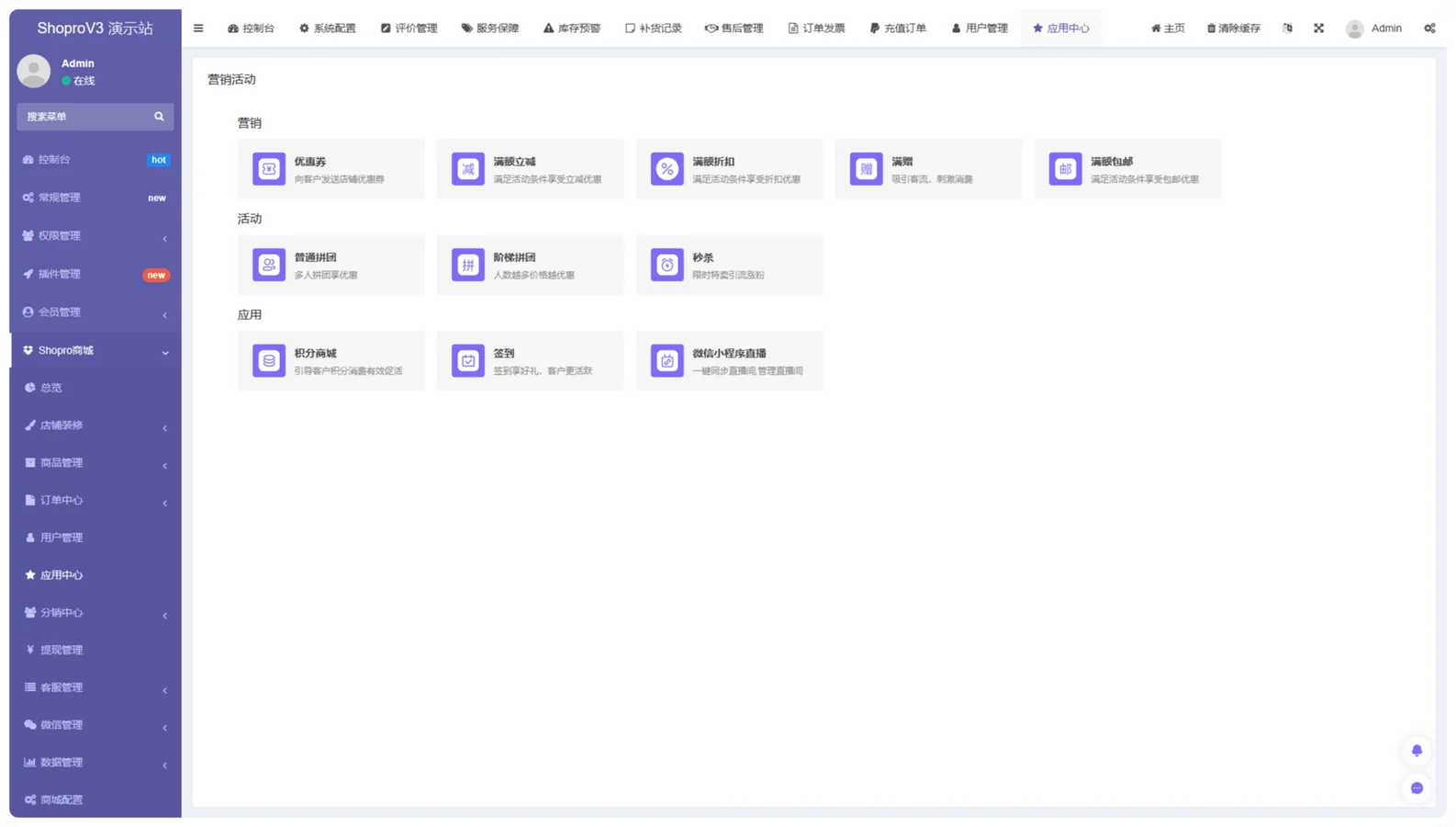 有搭建文档,版本是V3.10。本系统是单商户源码,基于fastadmin框架开发的插件,前端是Uniapp。支持多平台(微信公众号、微信小程序、H5网页、Android-App、IOS-App)购物商城,拥有强大的店铺装修、自定义模板、路由同步、多端支付(微信,支付宝)、多规格商品、运费模板、多地区邮费、库存管理、全端分享等功能。该有的功能基本都有拼团、分销、秒杀、客服、优惠券、积分商城、直播、页面DIY… 常用商城系统功能。为保证代码的版本,请下单联系客服索要源码