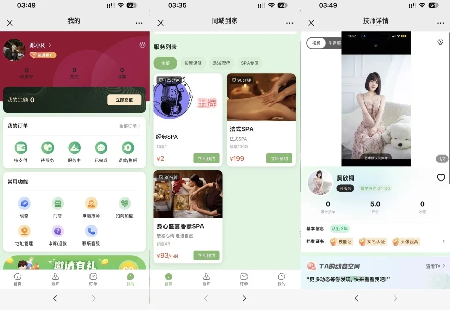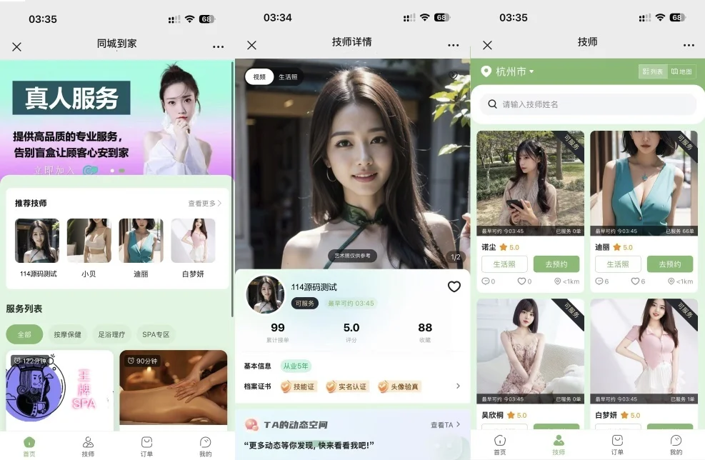 产品特征: 新ui界面设计,直观易用,设计精致,布局精致,体验感强,给用户以愉悦之感和舒适的视觉! 产品优势: 私有化独立部署、多角色独立端口、多种运营模式 1、用户端 预约服务 预约技师 技师推荐 店铺推荐 到店预约 个人中心 服务广场 等级会员 商户入驻 技师入驻 分销赚钱 客服中心 投诉中心 一键报警 2、会员管理 会员管理、认证管理、代理人、地址管理、VIP类别、会员卡、会员统计、会员报表、渠道会员报表 3、技师端 服务项目 服务时间 服务区域 订单管理 订单通知 发布动态 动态管理 在线状态 接单率 4、商户端 商户管理 申请列表 商户列表商户产品项目类型项目标签 商户提现列表 5、平台运营 数据大屏 运营数据 技师管理 技师数据 上架服务 6、订单管理 订单列表、评价列表、投诉列表、报警列表、订单报表、新用户下单报表 7、财务管理 充值管理、充值记录、提现账号管理、提现记录、商户流水、消费记录 8、优惠券 优惠券管理、优惠券列表、领券列表 9、手机端口(公众号) 10、管理端-PC 2025 更新记录 1、首页DIY新增广告图组件; 2、全新首页界面风格设计; 3、技师端全新的管理界面; 4、服务、技师等新增字段属性扩展; 5、优化订单流程模式; 6、技师列表页增加嵌入地图找人功能; 7、用户端定位交互优化; 8、优化语音提醒功能; 9、还有其它很多新增功能和优化项; 10、更多的推广及营销能力; 11、带全套后台和前端uniapp以及web源码;
