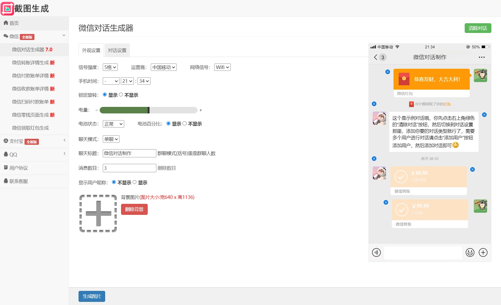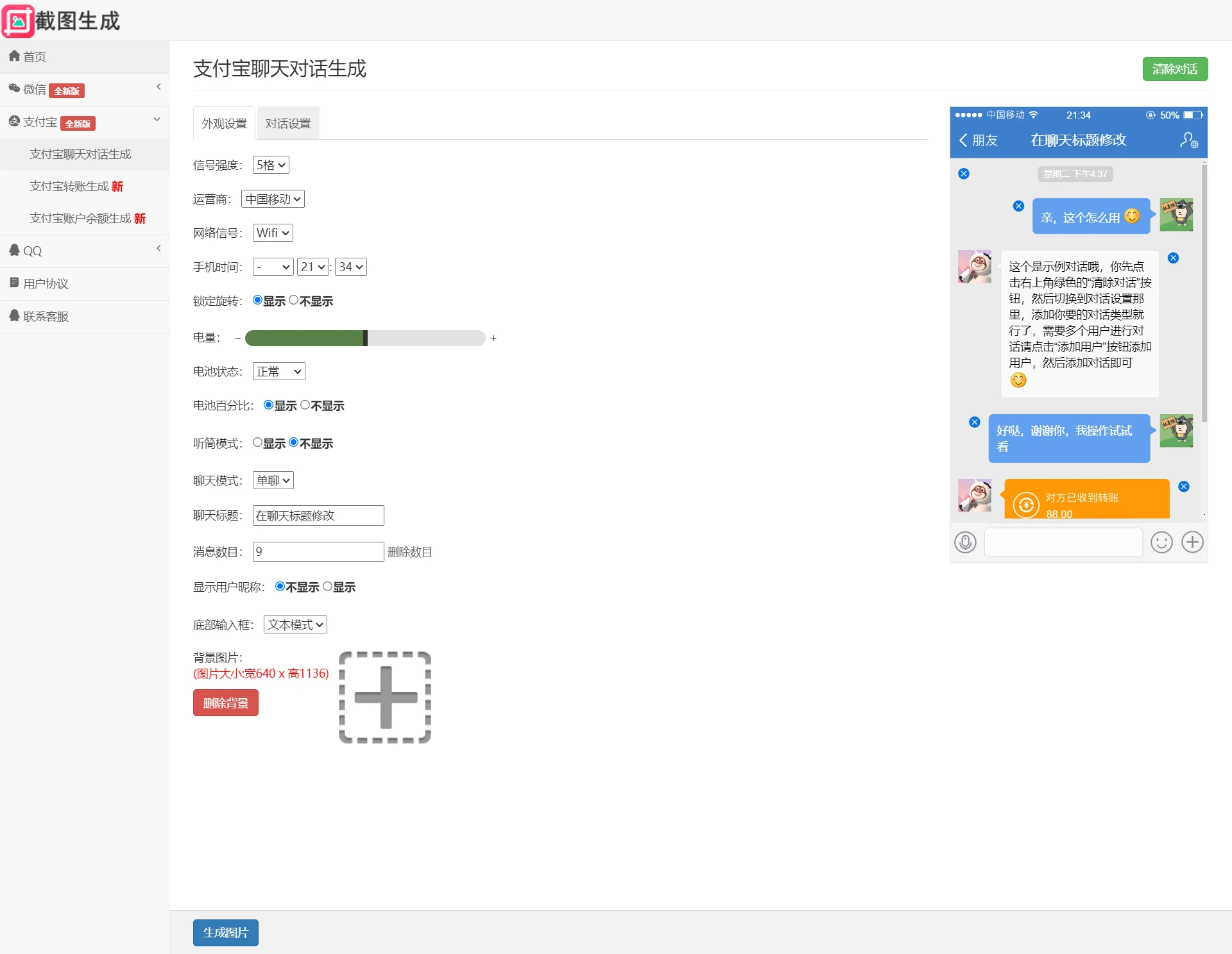 包含生成功能:微信对话、微信领取红包、微信付款详情、微信收款详情、微信转账详情、微信零钱页面详情、微信扫码付款账单、微信对话和红包带安卓设置、微信朋友圈转发详情、支付宝聊天详情、支付宝转账详情、支付宝账户余额详情、淘宝订单详情、QQ聊天详情、手机短信聊天详情!