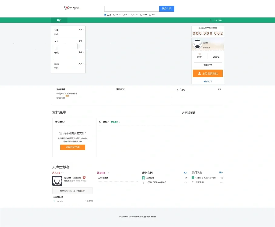 相信百度文库大家一定都是用过,在百度文库可以搜索我们需要的文档,然后进行在线阅读或者下载,当然,类似这样的网站除了百度文库还有很多,比如道客巴巴等等。今天给大家分享的是一款基于ThinkPHP5框架开发的仿百度文库在线文档门户系统源码,前台界面主要是模仿百度文库的模板,大家通过后面的截图可以一目了然能看出来,后台主要是采用国内成熟的ThinkPHP5作为底层框架,然后结合Layui前端框架搭建。该在线文档系统实现的功能基本与百度文库类似,可以在线阅读文档、下载文档、免费下载文档、财富值下载文档、文档分类、在线充值积分等等,用户可以对自己需求的文档进行悬赏。总的来说跟百度文库功能基本相似。后台集成通用权限管理系统,细分权限的管理者,不同用户采取不同权限控制,该系统集成了支付宝、微信、易宝支付等支付系统接口,用户充值支付手段更加丰富!该系统可扩展服务及插件,极大的方便了开发者扩展系统功能,有需要的可以下载学习,请勿用于商业用途!