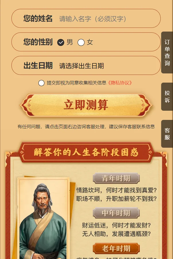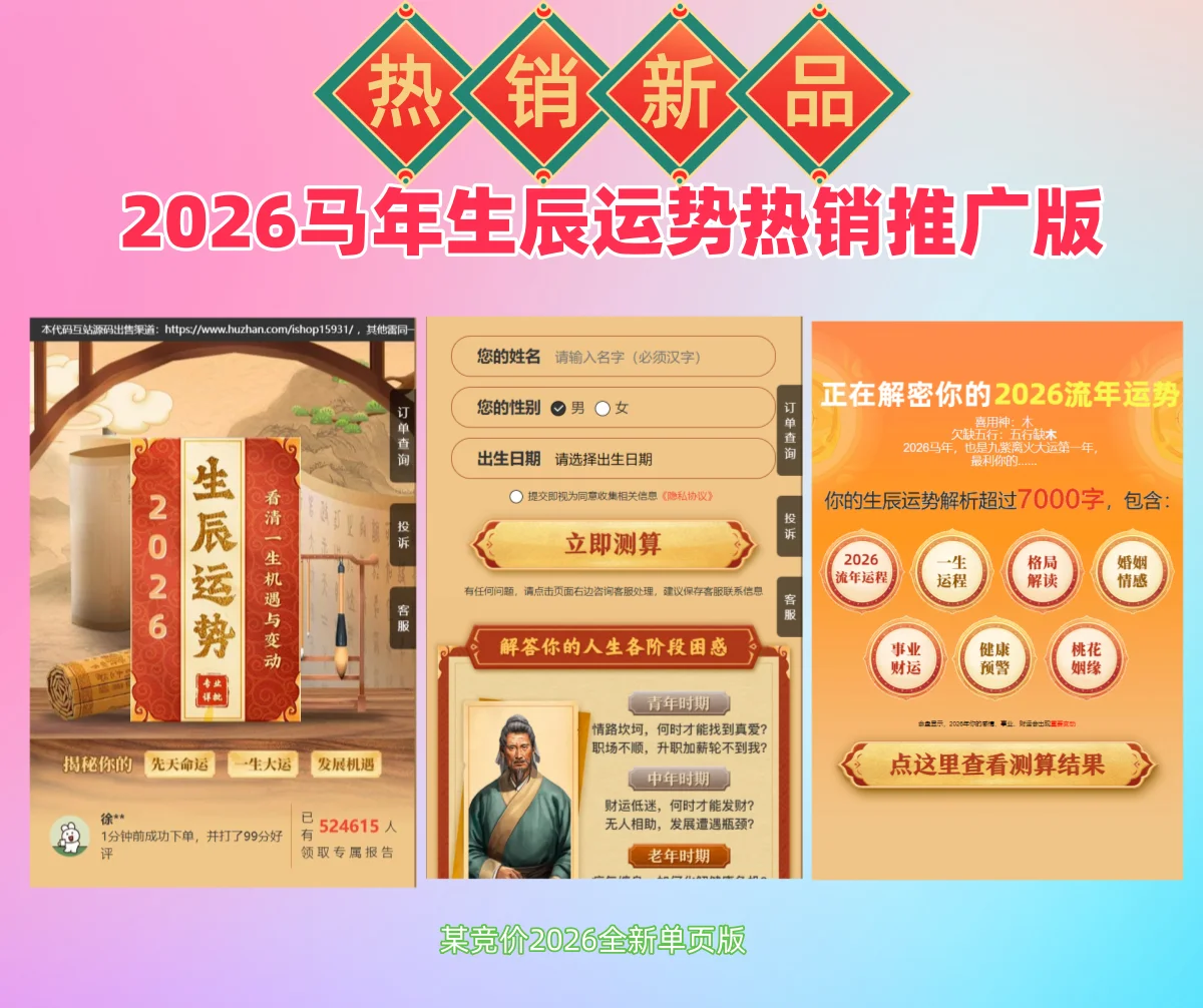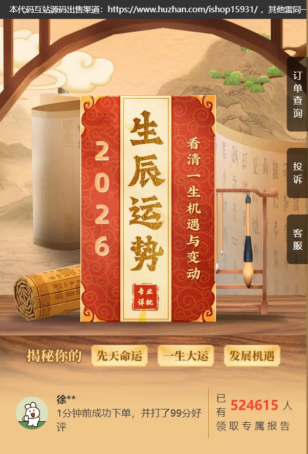 2026生辰运势详批源码/流年运势/蛇年运势测算系统/周易测算,一款二次开发后的运势运程测算系统,最近这类型的是比较火爆的,然后这款是单独进行定制设计的UI,测算的功能和过程都在下面演示视频里面展示!支付接口是微信和支付宝的官方接口,需要申请下来才可以使用!
